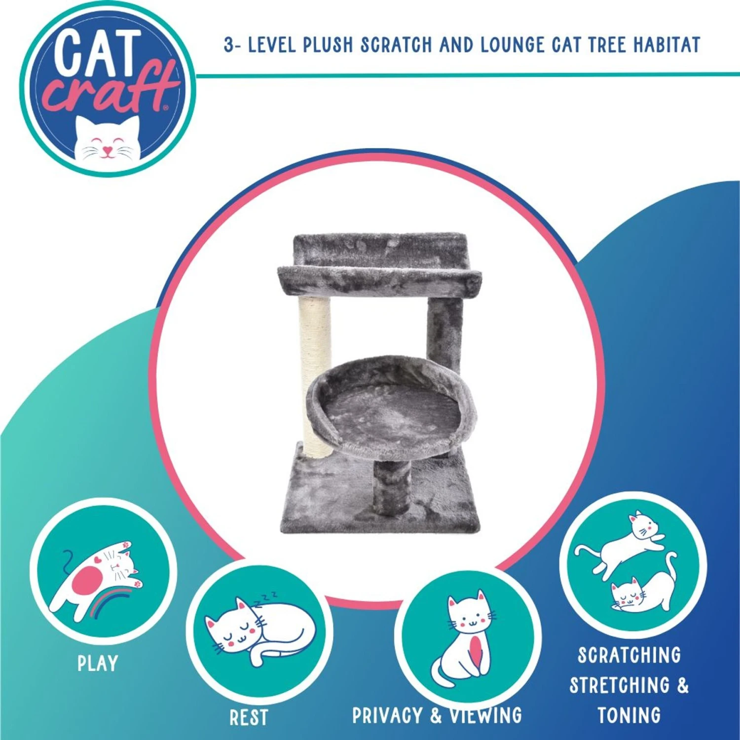 Give your kitty some purr-sonal space with the Cat Craft 3 Tier Plush Scratch & Lounge Cat Tree Habitat! This cat activity tree comes with a sisal rope scratch post, elevated cat bed and elevated cat lounge. The stylish design fits right in with your modern home decor and is easy to keep clean. Whether your kitty prefers to play, scratch or simply enjoy the view from above, make all her feline dreams come true with Cat Craft!
