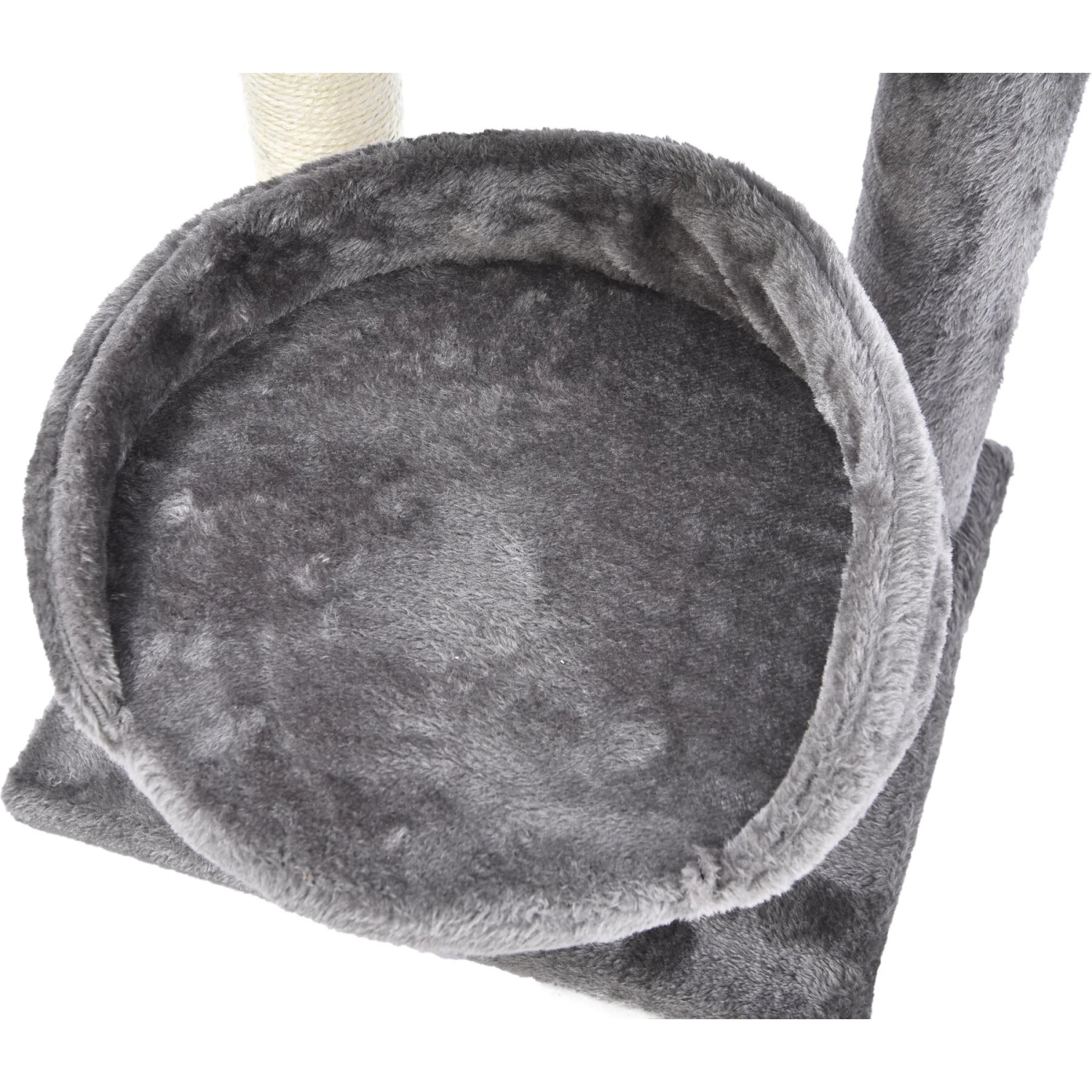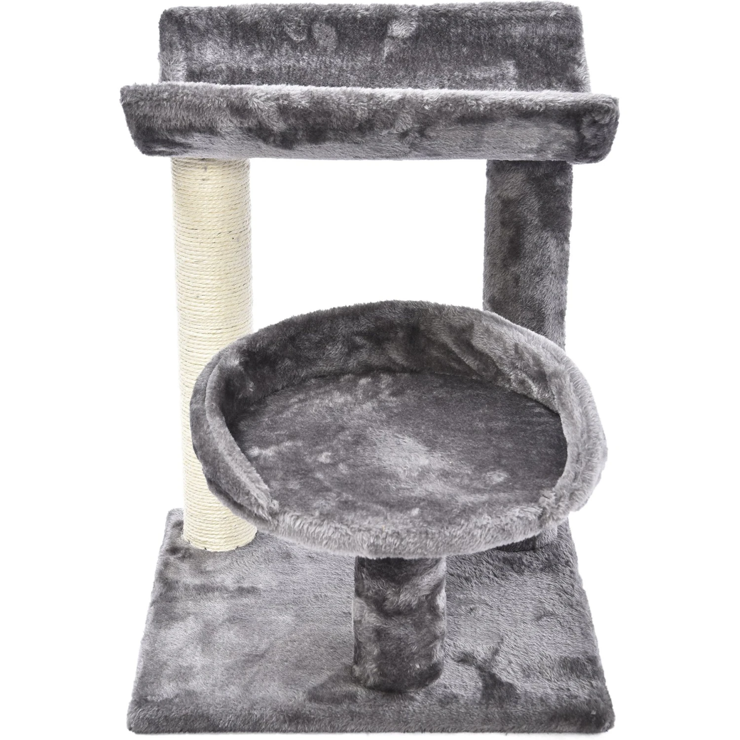 - This activity tree features a sisal rope scratch post, elevated cat bed and elevated cat lounge.