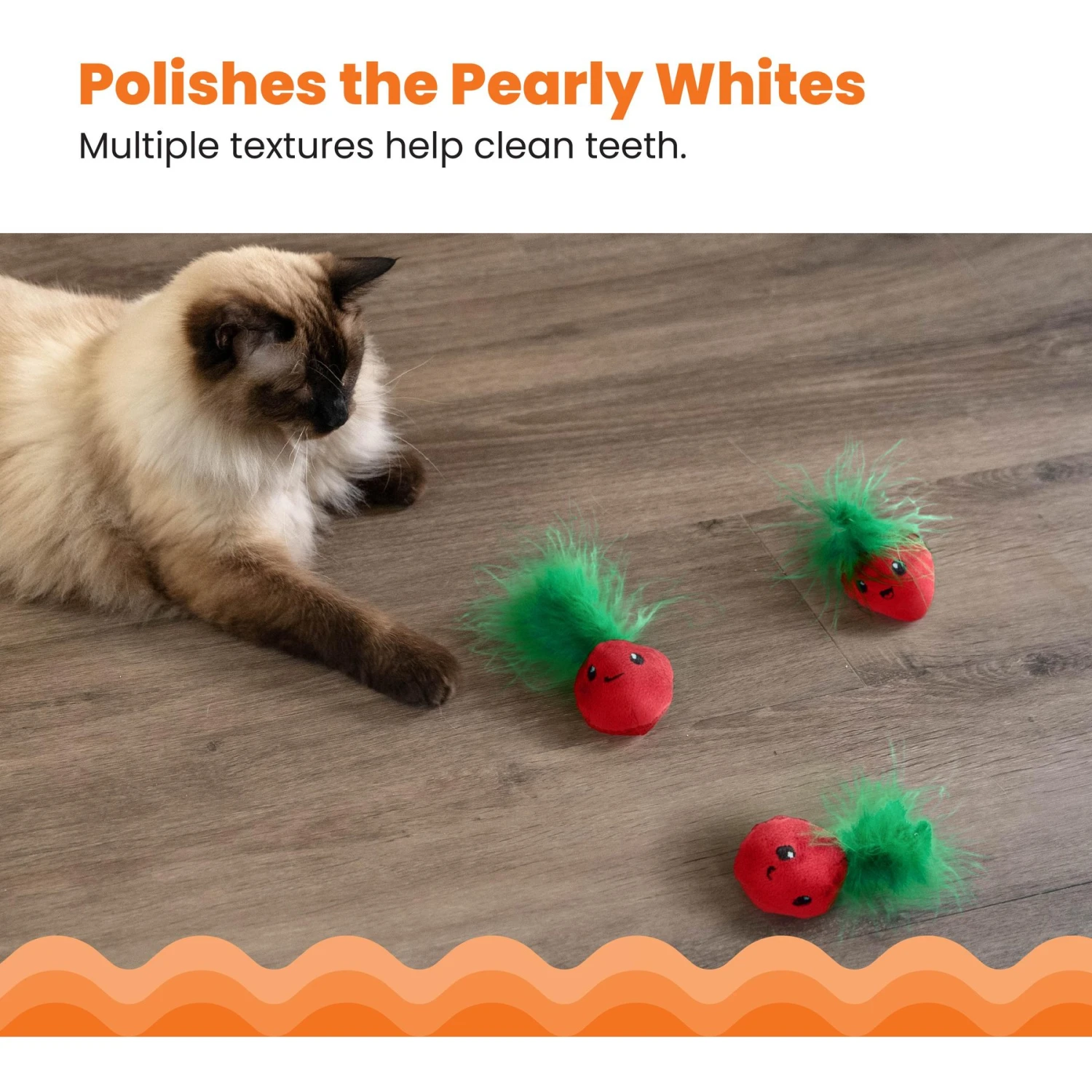 Help improve your kitty’s dental health without between vet visits with Petstages Strawbabies Catnip Dental Cat Toys. Stuffed with catnip and made with mesh netting material that’s gentle on the gums, these toys are irresistible to your feline friend. When your cat plays with these toys—constructed with feathers and bells—she’ll also be reducing her soft plaque and tartar. It’s a win-win.
