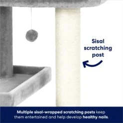 Your kitty is going places with this cat tree from Frisco by Chewy! There’s a perch to lounge on, a penthouse bed for catching z’s, a cozy private condo, and a toy to swat and bat. Oh, and there’s plenty of scratching room with three scratching posts that are fully wrapped with sisal rope. Sisal rope has the scratchable texture cats love because it feels a lot like scratching on tree bark, a feline favorite. Scratching is essential to keeping claws healthy and it feels good for kitties, too. The private condo is the perfect hangout spot for when your kitty wants some quiet time. That pretty much covers all the purr necessities—scratching, lounging, napping and playing. The double-layered baseboard provides extra stability as they scratch the posts and jump on and off, and it’s sturdy enough for larger kitties.