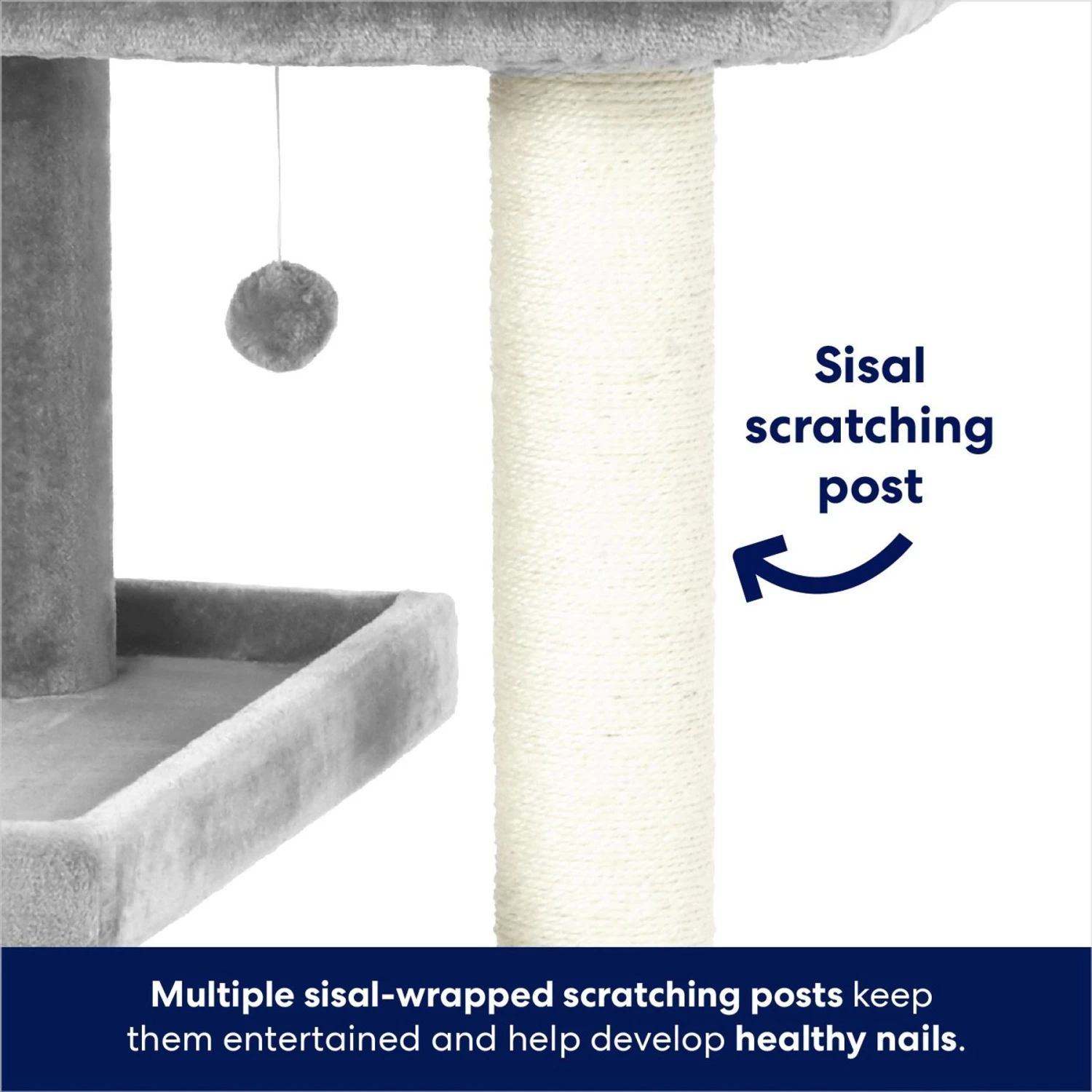 • From Frisco by Chewy. Three long scratching posts fully wrapped with rough, durable sisal rope for more satisfying scratching, plus built-in fluffy toys to attract their playful side.