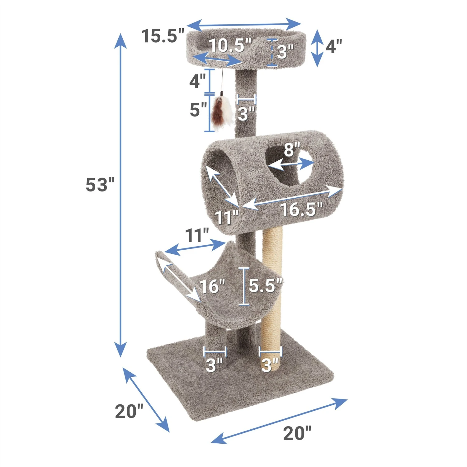 - 53-inch cat tree with three levels, including two perches and a roomy tunnel.