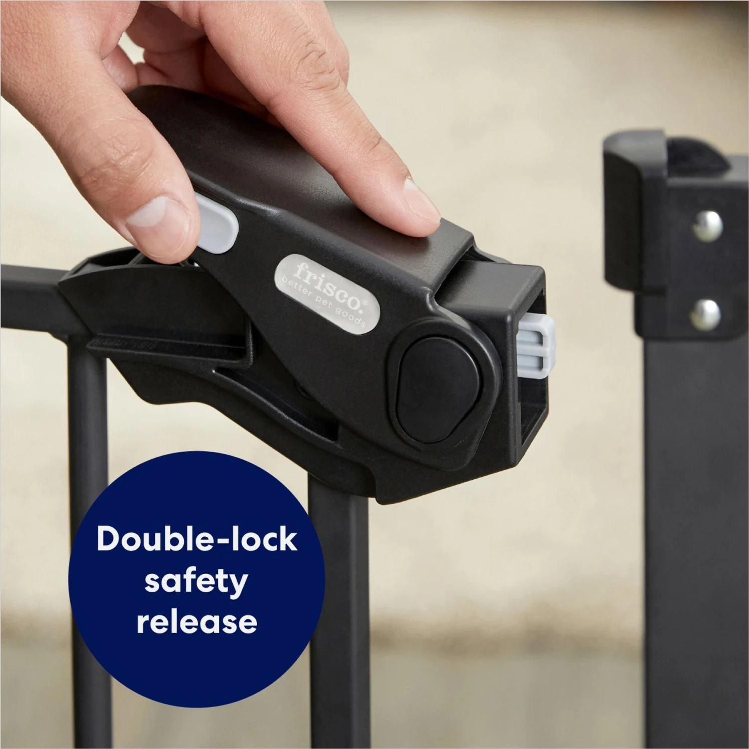 Check out the Size Tab to be sure this gate fits your doorway. Turn any room in the house into a safe zone for your pet with this extra-wide pet gate from Frisco by Chewy. Made with a durable all-steel construction, this gate is designed to keep your pet safely contained by simply installing it in a door frame or hallway. The pressure-mount system makes setting it up and taking it down easy, so you can move it to different areas of the house and have it up and ready in just a few minutes. The gate door works double duty by staying open when you need it to—just open it past 90 degrees to lock it open—or otherwise closing on its own. You can also set up the door to open to any side. The dual-lock safety release means your pal can’t get crafty and open the door, adding a layer of security. Plus, this gate is lightweight so you can transport it and store it easily.