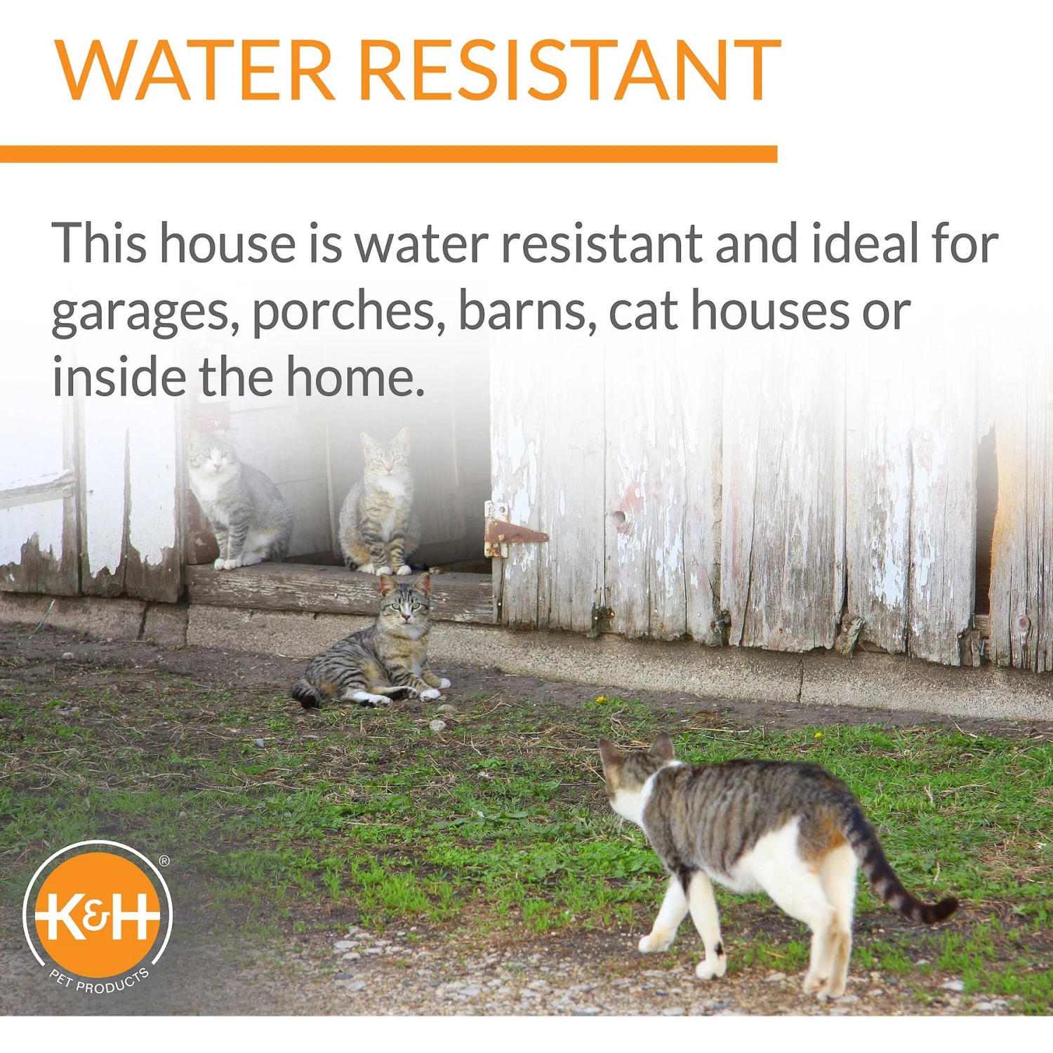 Give your kitty a warm place to curl up with the K&H Pet Products Outdoor Heated Kitty House Cat Shelter. This heated house is excellent for use in barns, garages, porches or anywhere your indoor/outdoor cat may need additional warmth and protection from the elements. Heavy denier polyester construction and an insulated roof and walls make the house water- and weather-resistant, and the roof overhangs the two doors to keep the interior warm and dry. Dual exits with removable plastic flaps provide easy access and help ensure your cat won’t be trapped by predators. The outdoor kitty house comes with an MET Safety Listed 20-watt Lectro-Soft Indoor/Outdoor Heated Bed to keep your kitty toasty all winter long—even in sub-zero temperatures. The heated bed is controlled by an internal preset thermostat to safely keep your cat warm. This outdoor cat shelter is easy to assemble, with no tools required, and is a great way to protect cats from the elements in cold or inclement weather. Set one up to protect your favorite feline or any outdoor cats in your neighborhood!