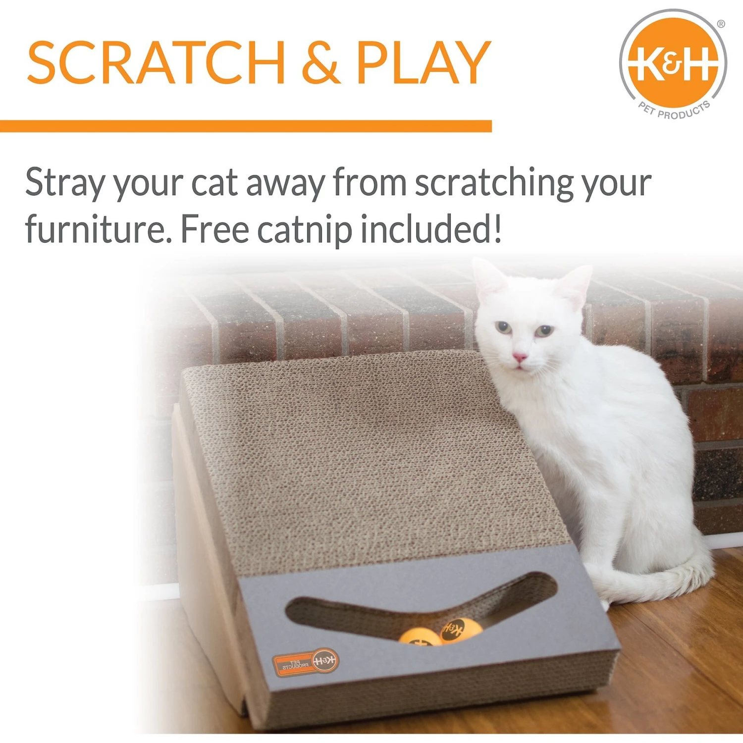 Capture your kitty’s attention with the K&H Pet Products Scratch, Ramp & Track Cat Scratcher Toy with Catnip. This toy comes to life as a scratching ramp with a fun, two-ball track to swat and bat at! This scratch toy gives your cat a healthy outlet for their natural urge to scratch and groom their claws. Plus, each toy comes with a small bag of catnip to help get the paw-ty started!