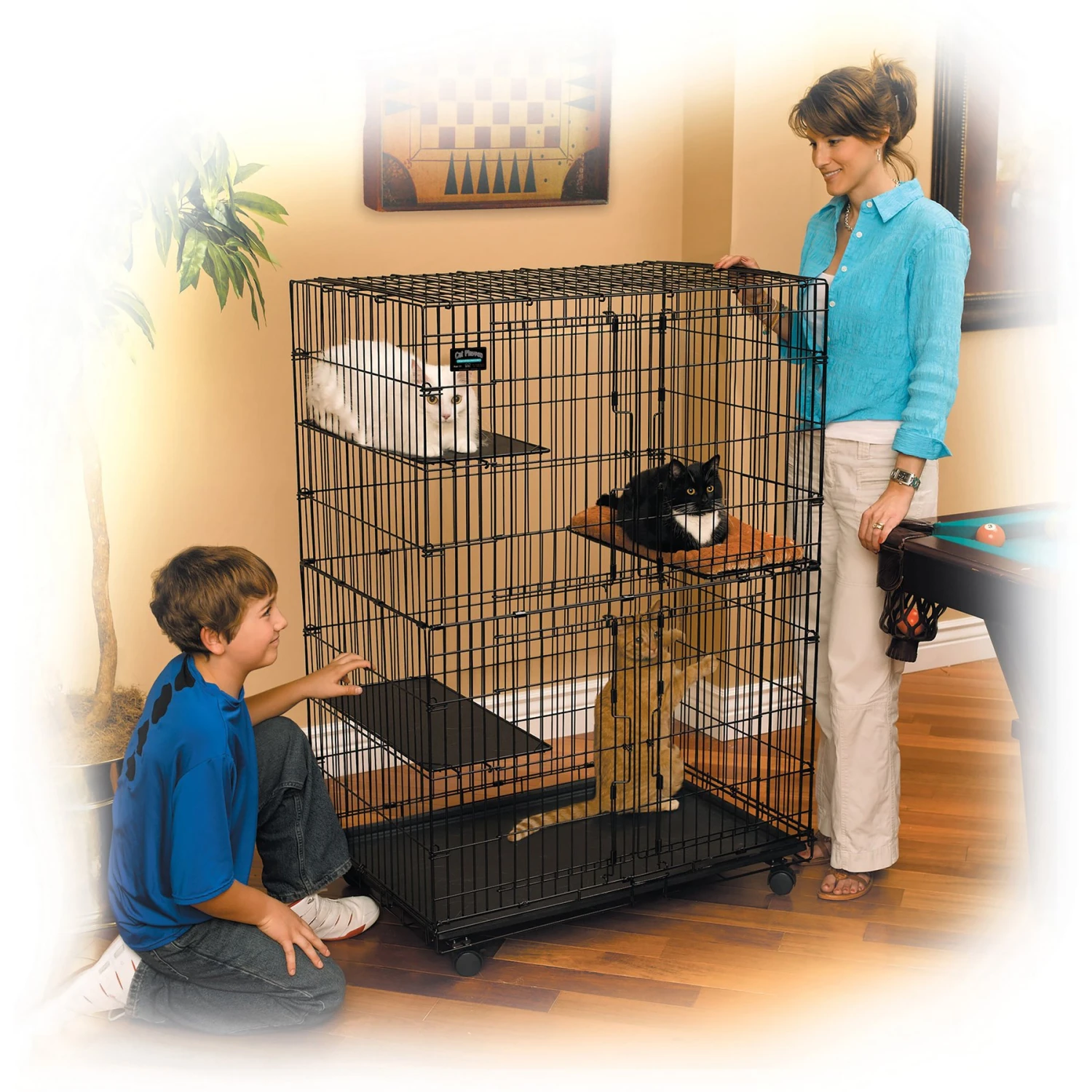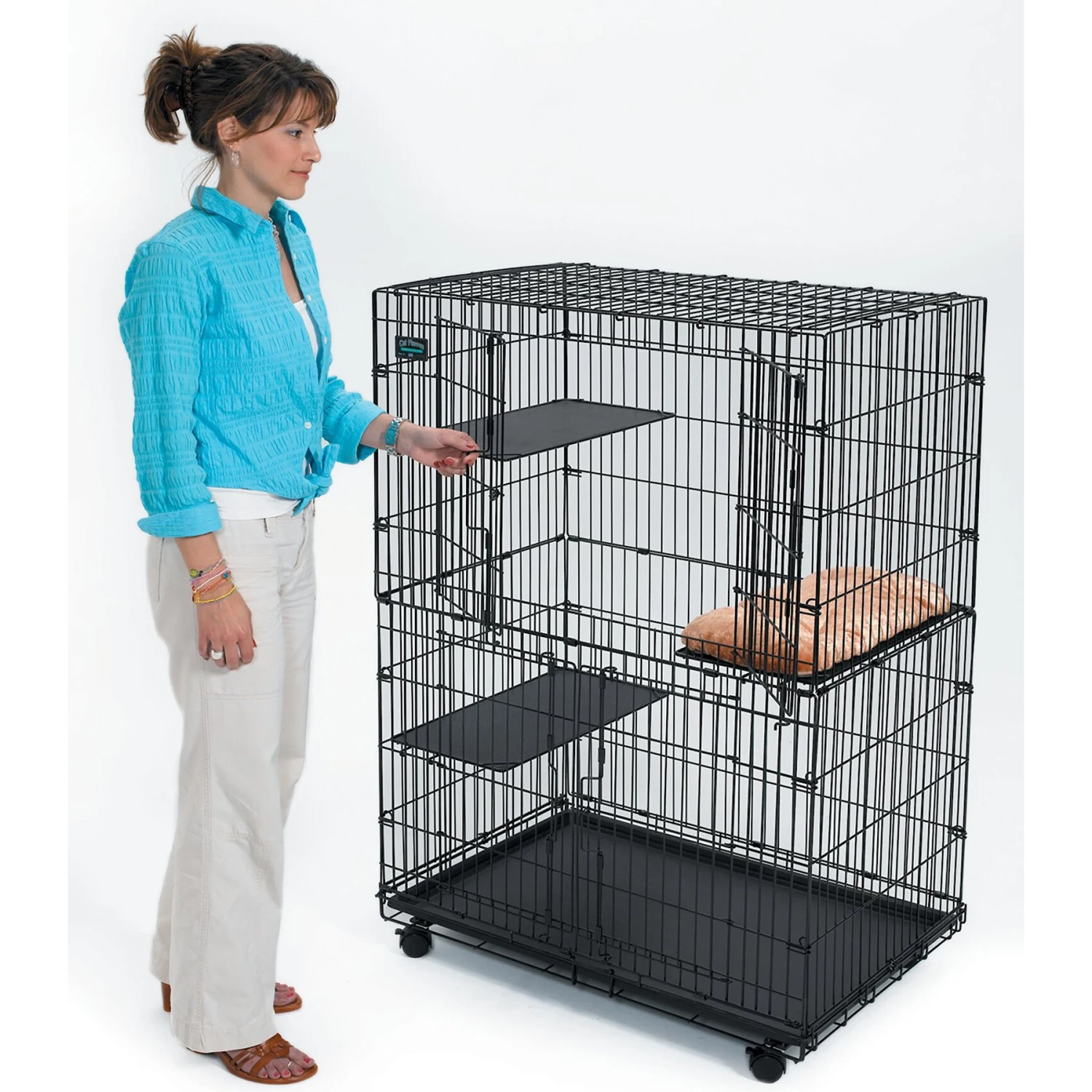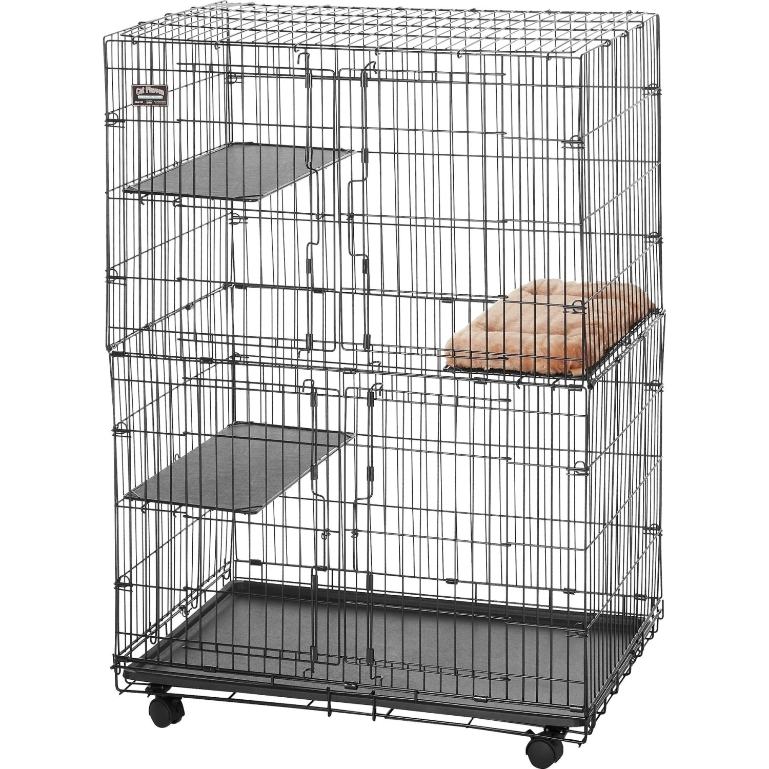 Give your favorite feline her own place to lounge with the MidWest Collapsible Wire Cat Cage Playpen. This roomy cat playpen features three adjustable platforms–providing ample room for your kitty to rest and play. Designed with your pet’s instincts and lifestyle in mind, this playpen comes with a comfortable chenille cat bed that’s paw-fect for cat naps and that can be securely attached to any of the shelves. It features top and bottom, large, cabinet style front doors with secure door latches for easy access to your BFF and convenient cleaning. The generous base provides space to store toys, scratching posts, or even your cat’s litter box. An easily removable, leak-proof tray is included to catch stray cat litter. Just slide the tray out of the pen and dump the loose litter in the trash when it’s time to clean. The slide-out tray, cage and shelves can all be washed with a mild detergent and air dried. Four locking wheel casters let you position this playpen anywhere in your home, so you can always keep your BFF close. A contemporary black e-coat finish complements your décor, protects against rust, and is easy to clean. Plus, this cat playpen folds down for easy storage when not in use. Best of all, you can get extra cat beds or shelves (each piece sold separately) if you want to customize your paw-tner’s pen.