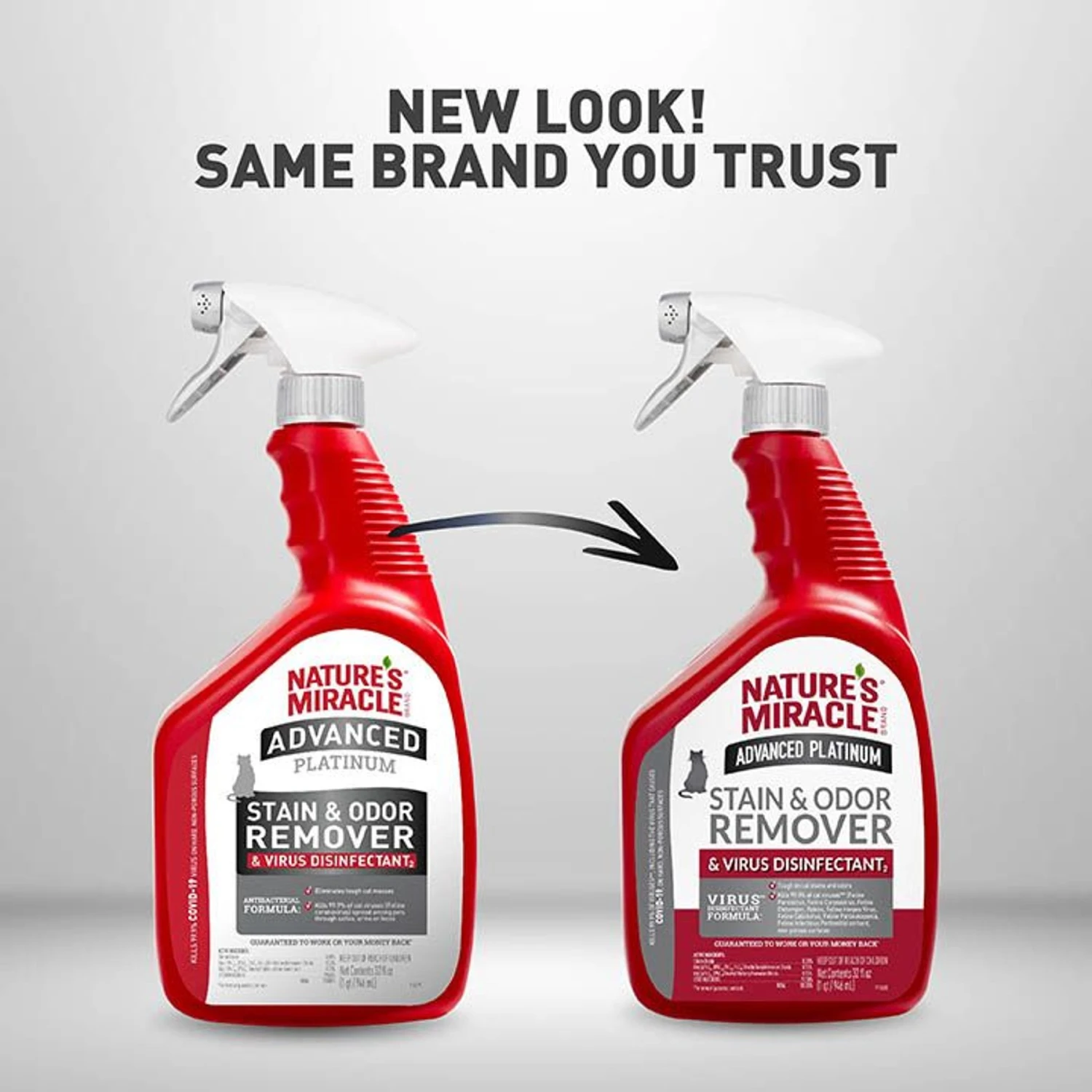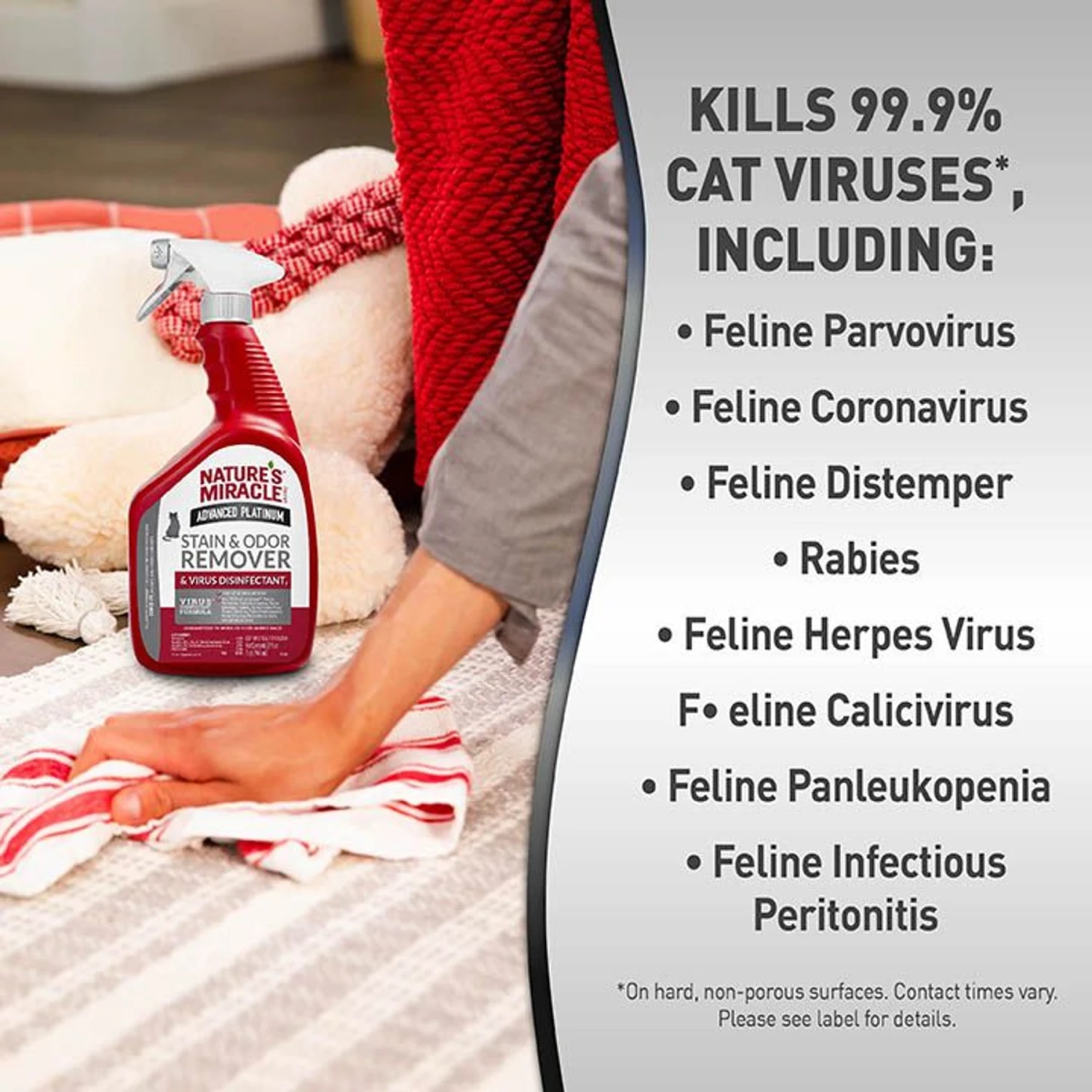 Combat stink, stains and viruses with Nature’s Miracle Advanced Platinum Cat Stain & Odor Eliminator Spray! This antibacterial solution is formulated to kill 99.9 percent of cat viruses like feline coronavirus which is typically passed to other pets through urine, feces and saliva. It also helps fight unpleasant messes and odors, making it purr-fect for homes, cars, grooming facilities, veterinary clinics and more! Use it on your carpets, your cat’s lounging areas, inside carriers, crates, on bedding, toys and even your feline friend’s litter box.