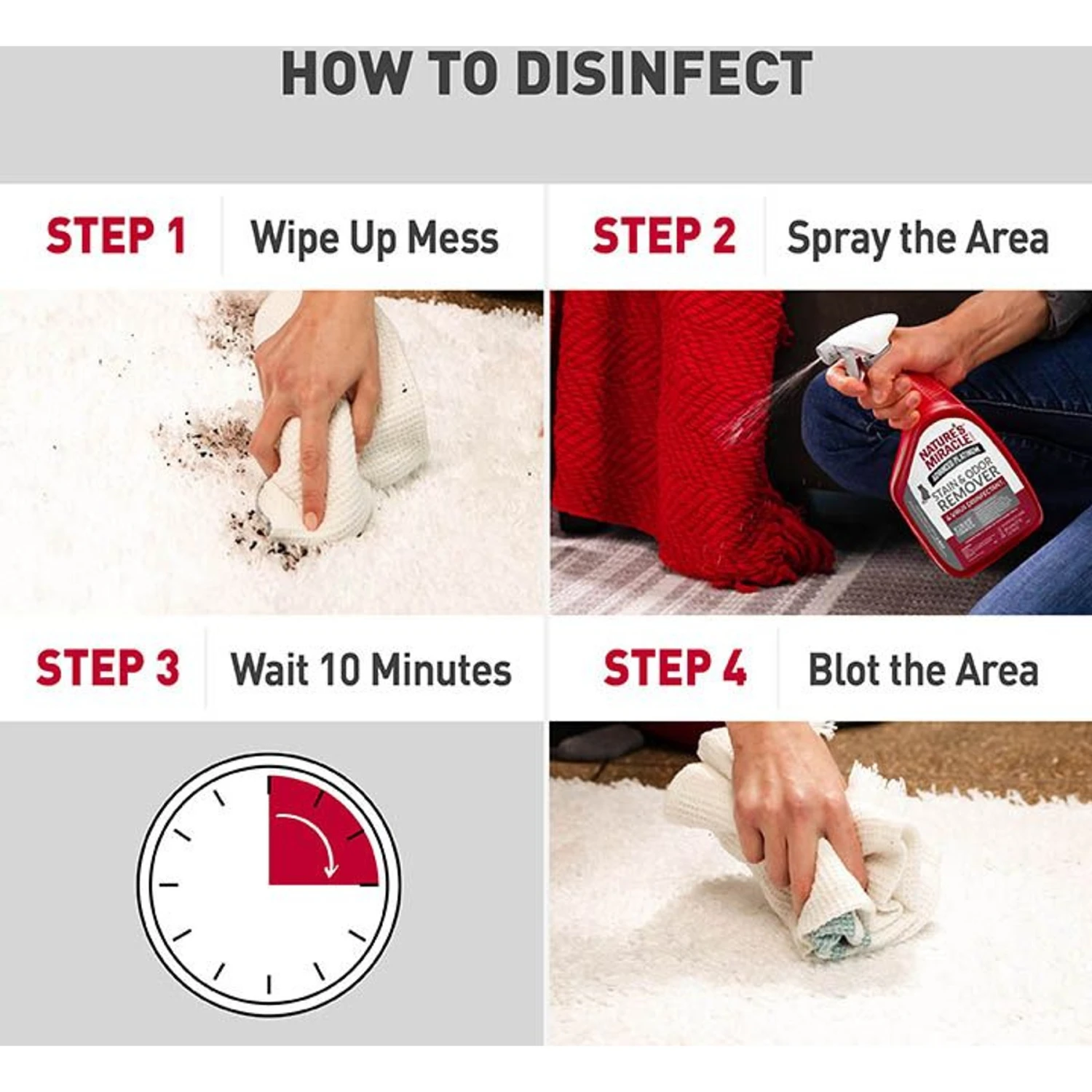 Before using, test surfaces to be treated for color fastness by applying to a hidden area. Wait 1 hour, then wipe with cloth. If color is removed from the test area, do not use Nature’s Miracle Advanced Stain & Odor Eliminator on those surfaces. Do not use on untreated hardwood, leather, suede, silk or wool specialty fabrics. Always use this product full strength. Do not dilute. Always use Nature’s Miracle Advanced Stain & Odor Eliminator products first. Other cleaners and detergents may fail and chemically “set” stains that will be impossible to remove.