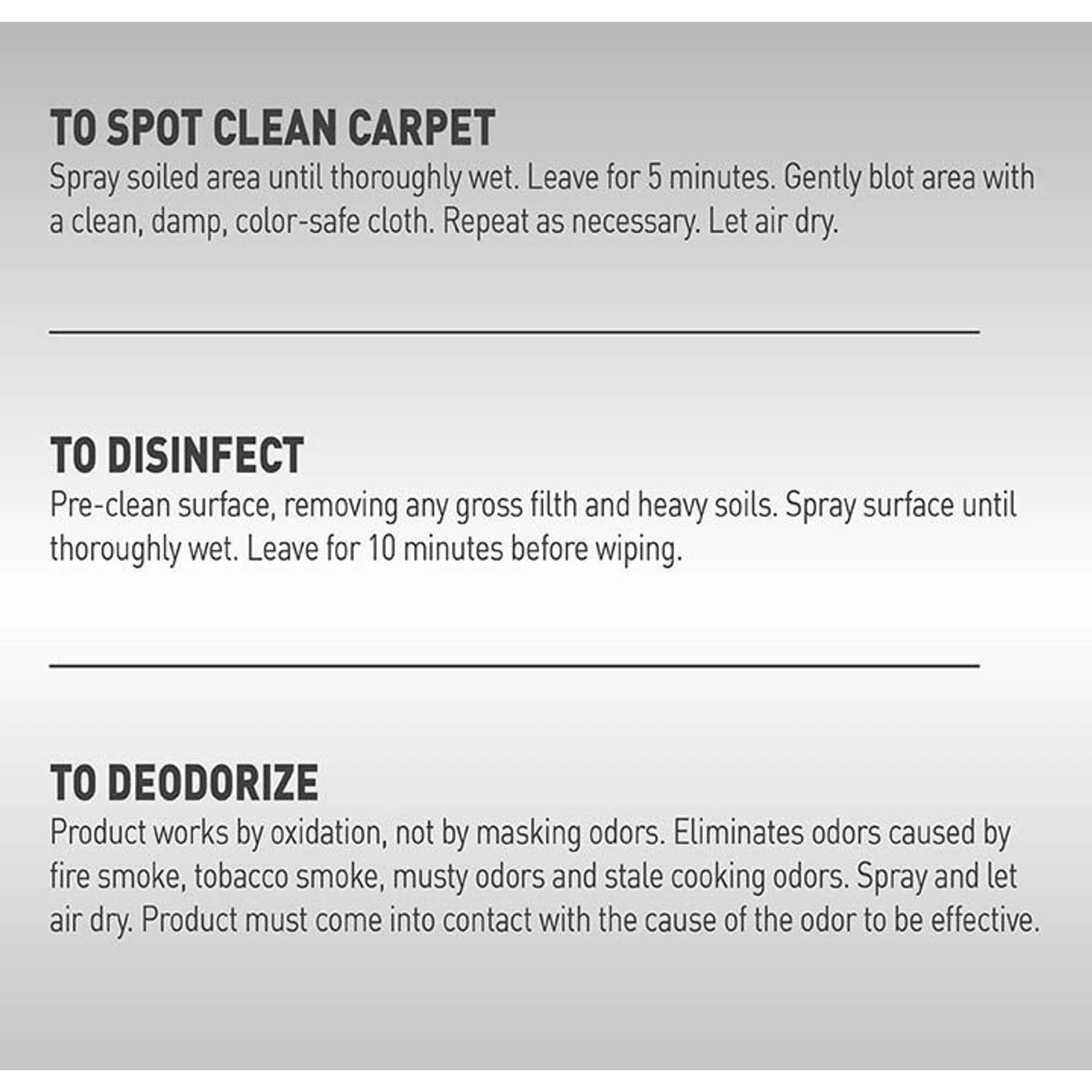 Wipe up excess odor-causing material, then thoroughly soak area with this product. Saturation is important so that this product can penetrate deeply to the odor source. In carpeting, this may mean lifting carpel and applying directly to the pad and floor.