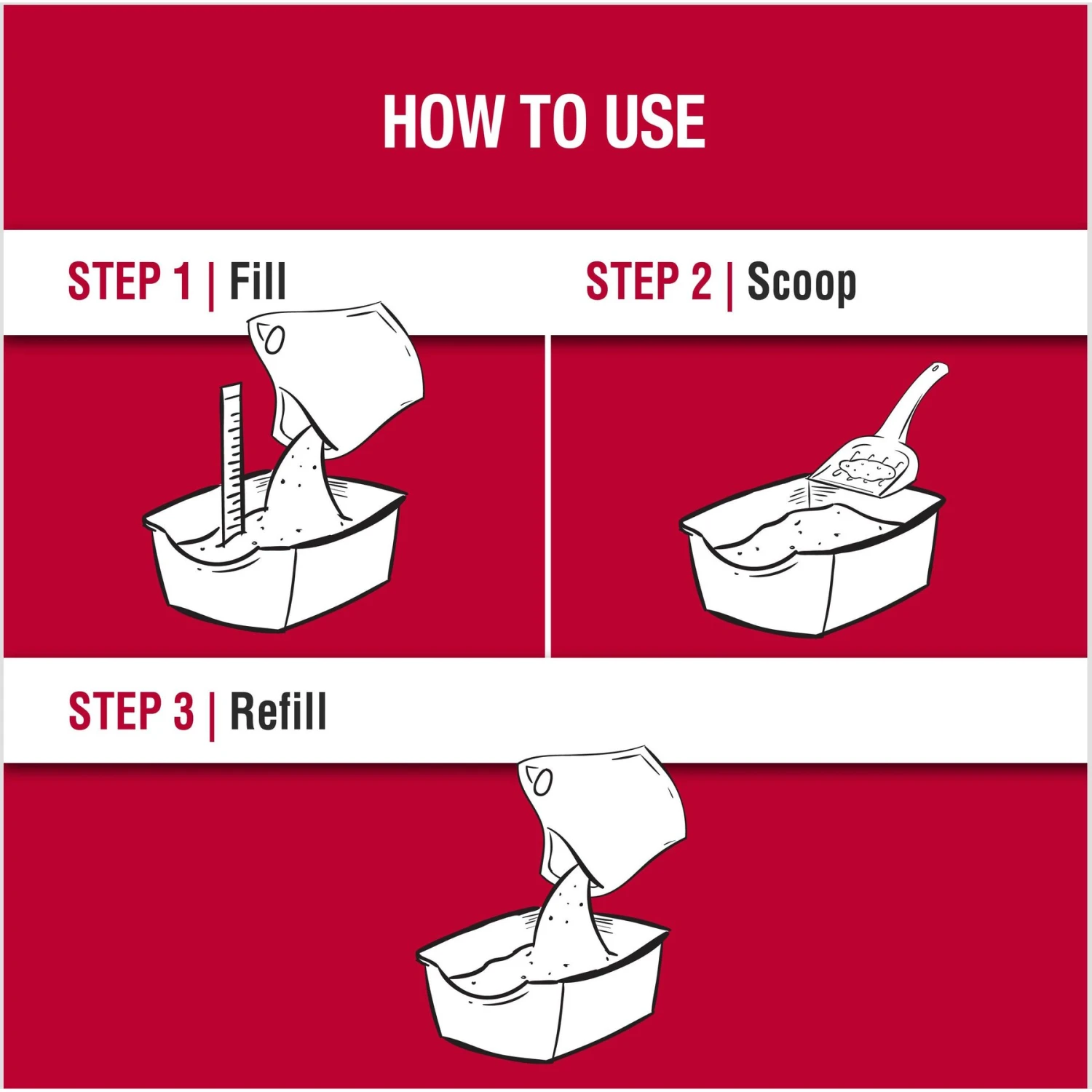- Fill litter box 2-3 inches deep with litter. Scoop clumps and remove waste daily to ensure maximum freshness and odor control. Add more litter to maintain depth of 2-3 inches.