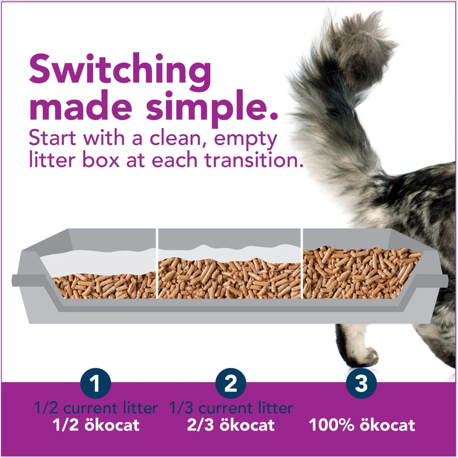 Fill the empty litter box with 2 inches of ökocat and pour only 1 inch of your existing litter on top. Let your cat mix the litters as they are used.