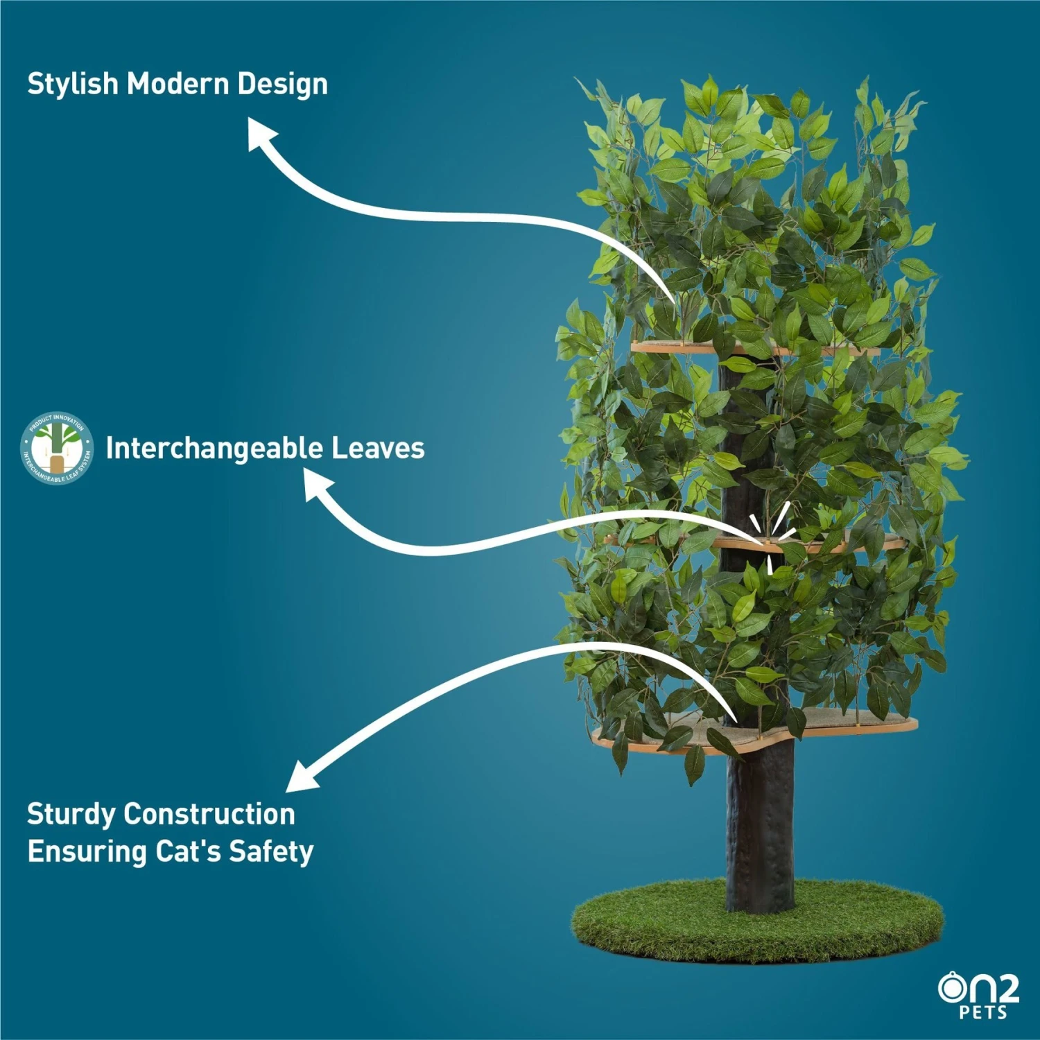 Give your cat the thrill of a great outdoor climb, without ever leaving the house. The On2Pets 60-in Large Round Modern Cat Tree appeals to your feline friend’s natural instincts of staying somewhere high and out of sight—a true kitty paradise! Your cat can survey her world from the safety of the silk-leaf canopy on three different perches, hidden and secure. This realistic cat tree is a purr-fect blend of form and function—not only will your kitty have a comforting place to relax and call her own, the sleek design of the rounded cat perches and various color options of the faux-leaf canopy will bring a bit of nature right into your home.