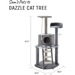 Sam’s Pets Dazzle 47-in Cat Scratching Tree is designed with multiple tiers, toys, scratching posts and places to climb! Your feline friend can relax on one of the several perches or lounge in the hammock—the polyester fur provides maximum comfort. This cat tree is big enough to support multiple kitties and it’s constructed from high-quality materials that are durable and built to last!