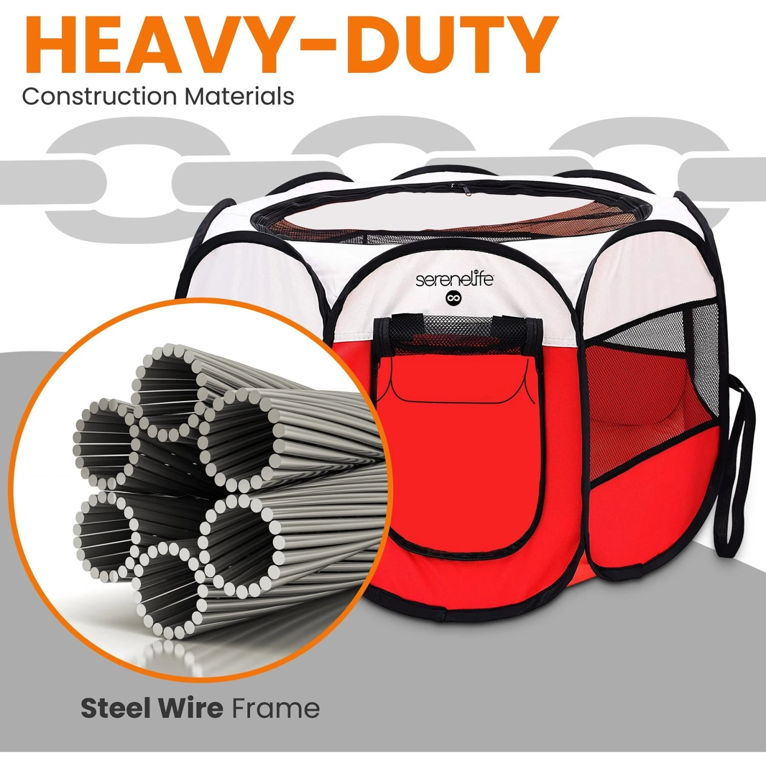 Give your furry friend a safe place of his own wherever you go with a SereneLife Portable Foldable Dog & Cat Tent. Designed for indoor or outdoor use, this lightweight, portable pet tent is a snap to set up and fold, so you can bring it with you on all your ex-paw-ditions. It’s made of strong oxford and flexible, thick mesh, with no assembly required. The rollable, zippered mesh door and two exit spots make it easy for your fur-iend to get in and out. Plus, this paw-some tent comes with a collapsible, dishwasher-safe pet dish—making it convenient to offer food or water to your pal whenever he needs it. It’s the paw-fect play place for your small dog, cat, bunny, ferret and more!