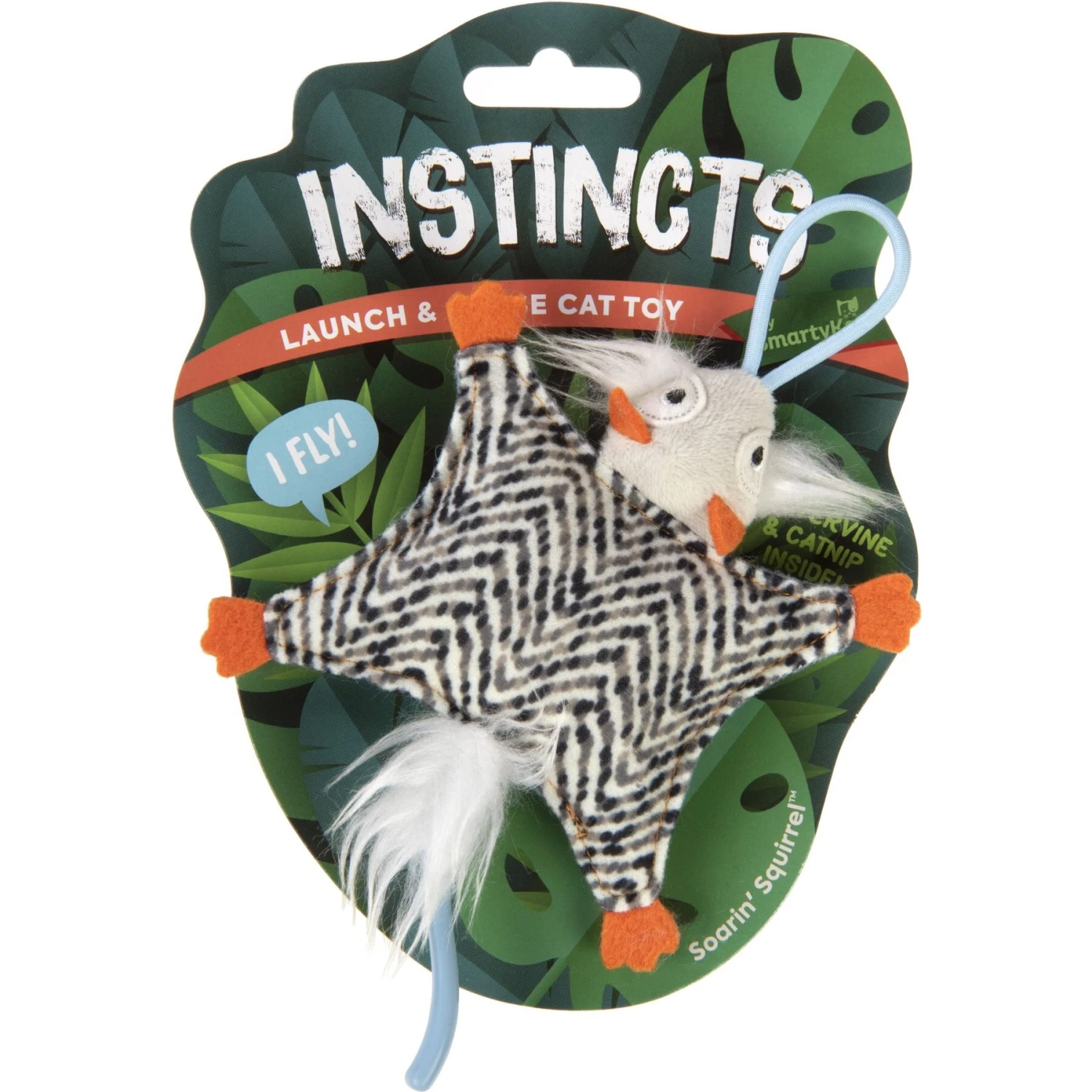The Instincts by SmartyKat Soarin’ Squirrel HappyNip Silvervine & Catnip Crinkle Plush Launch & Chase Cat Toy is purr-fect for leaping, chasing, swatting and pouncing. Its unpredictable motions appeal to your furbaby’s instincts to chase and hunt. Use the “hair-tie” elastic launcher and stretchy tail to fling this flying squirrel toy through the air. Or, use it to dangle for your kitty to leap and swat. Silvervine and catnip, crinkle textures, faux fur, plush and felt all make playtime extra fun.