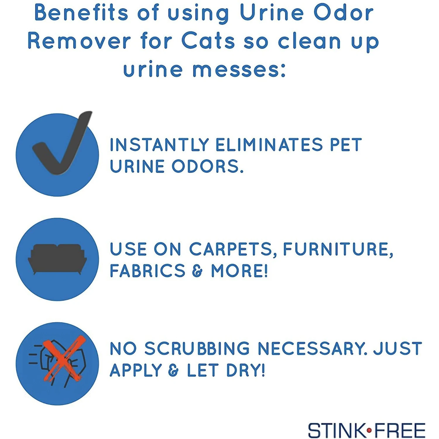 When your kitty decides the world is her litterbox, reach for Stink Free Cat Urine & Odor Remover to get rid of that nasty urine smell. Stink Free uses an oxidative process to break down the chemical compounds in cat pee and render them so inert and odorless, your cat won’t even be able to smell them! A system of odor neutralizers adds an extra step of deodorization to make sure the odor gets all the way obliterated and stays that way. Just saturate the offending area with Stink Free and you’re done—no scrubbing or blotting required!