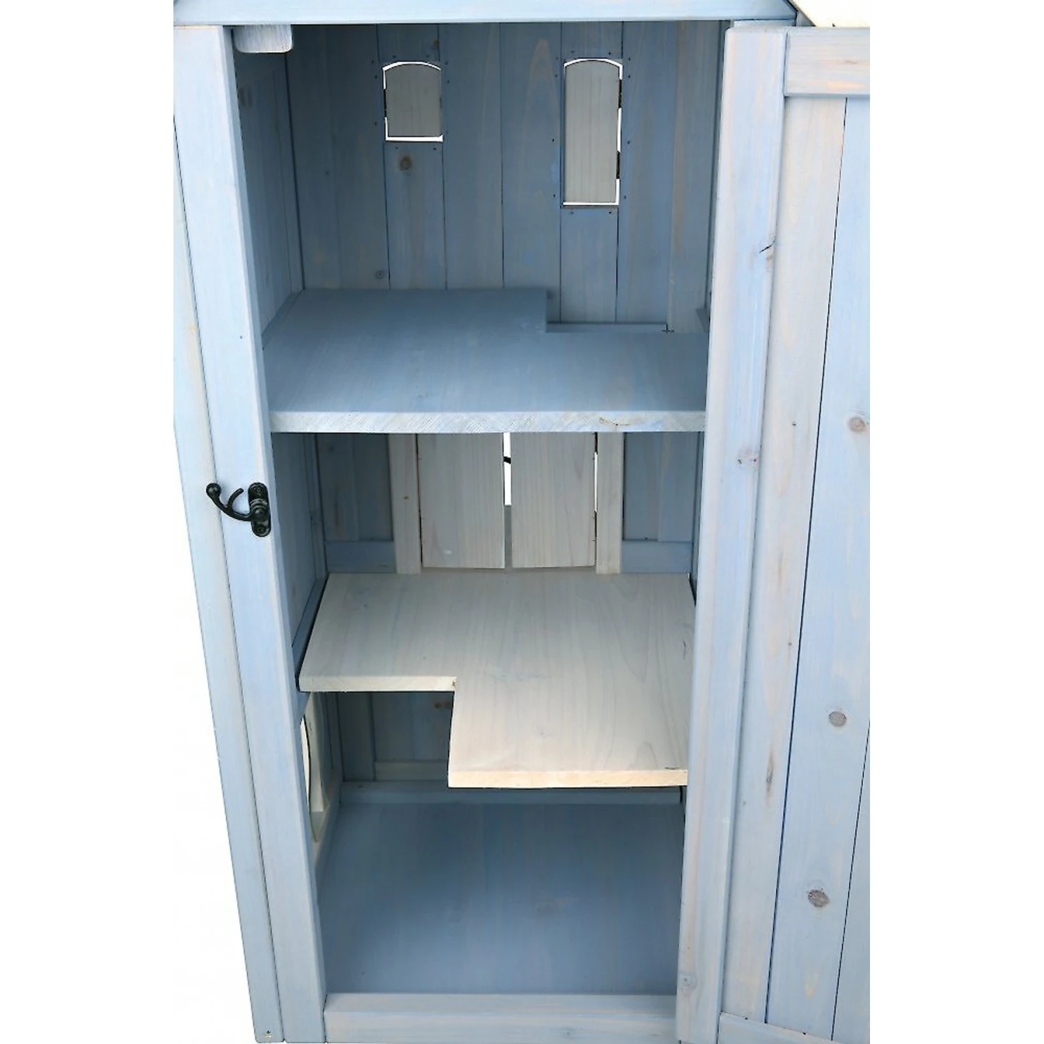 Trixie 3-Story Wooden Outdoor Cat Home provides your cat with a secure and relaxed environment. Made with a sturdy wooden design and waterproof finish, it can be used both indoors and out. Charming hinged shutters and peek-a-boo holes add a touch of elegance and a great place for play. Two kitty doors allow for quick entry, and one large hinged door at back makes for easy maintenance. Slatted plastic flaps inside the doors keep out wind and rain. The bottom floor is raised to allow air to circulate, keeping the floor dry and comfortable. And once inside, your cat will love exploring and relaxing on three separate floors of fun. This outdoor cat home is suitable for cats of all ages and activity levels.