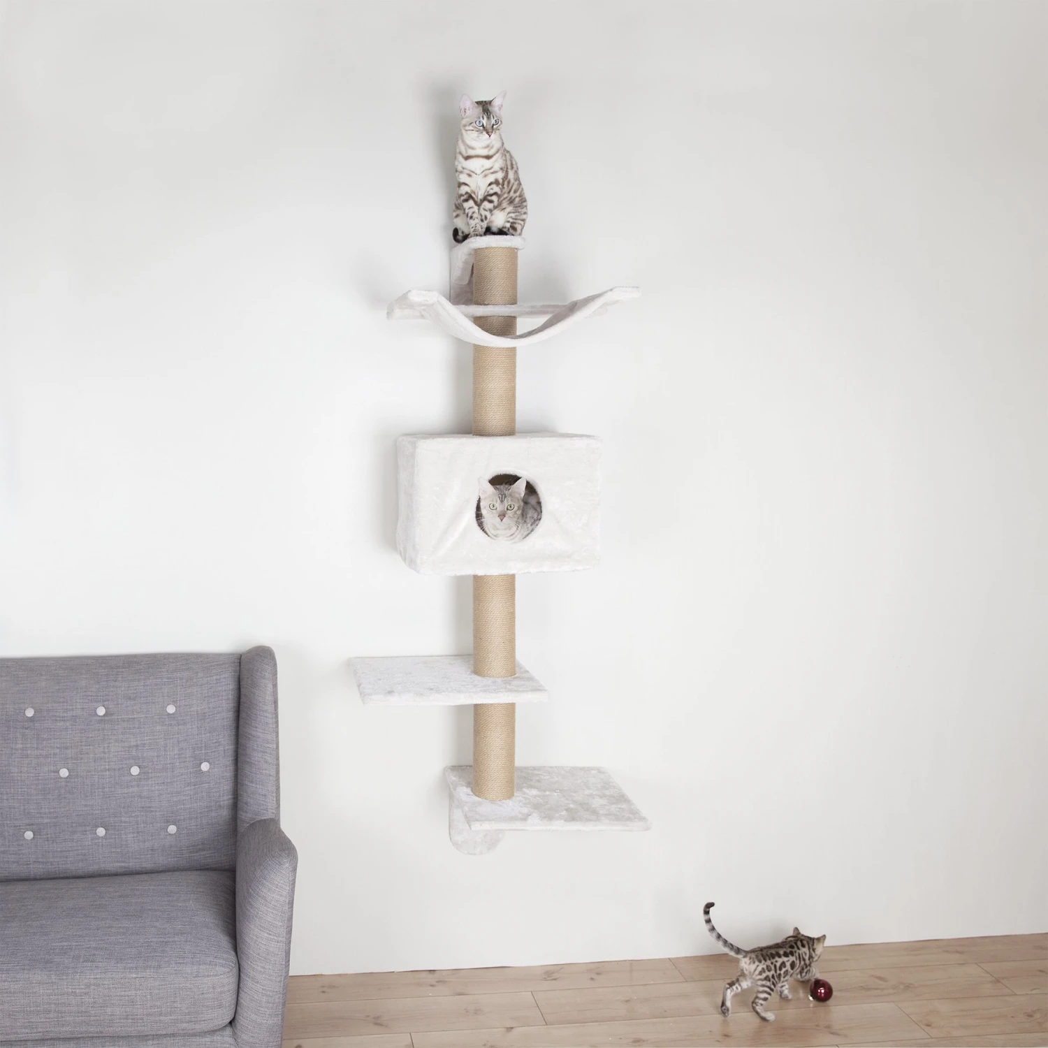 - Wall-mounted cat tree saves precious floor space.