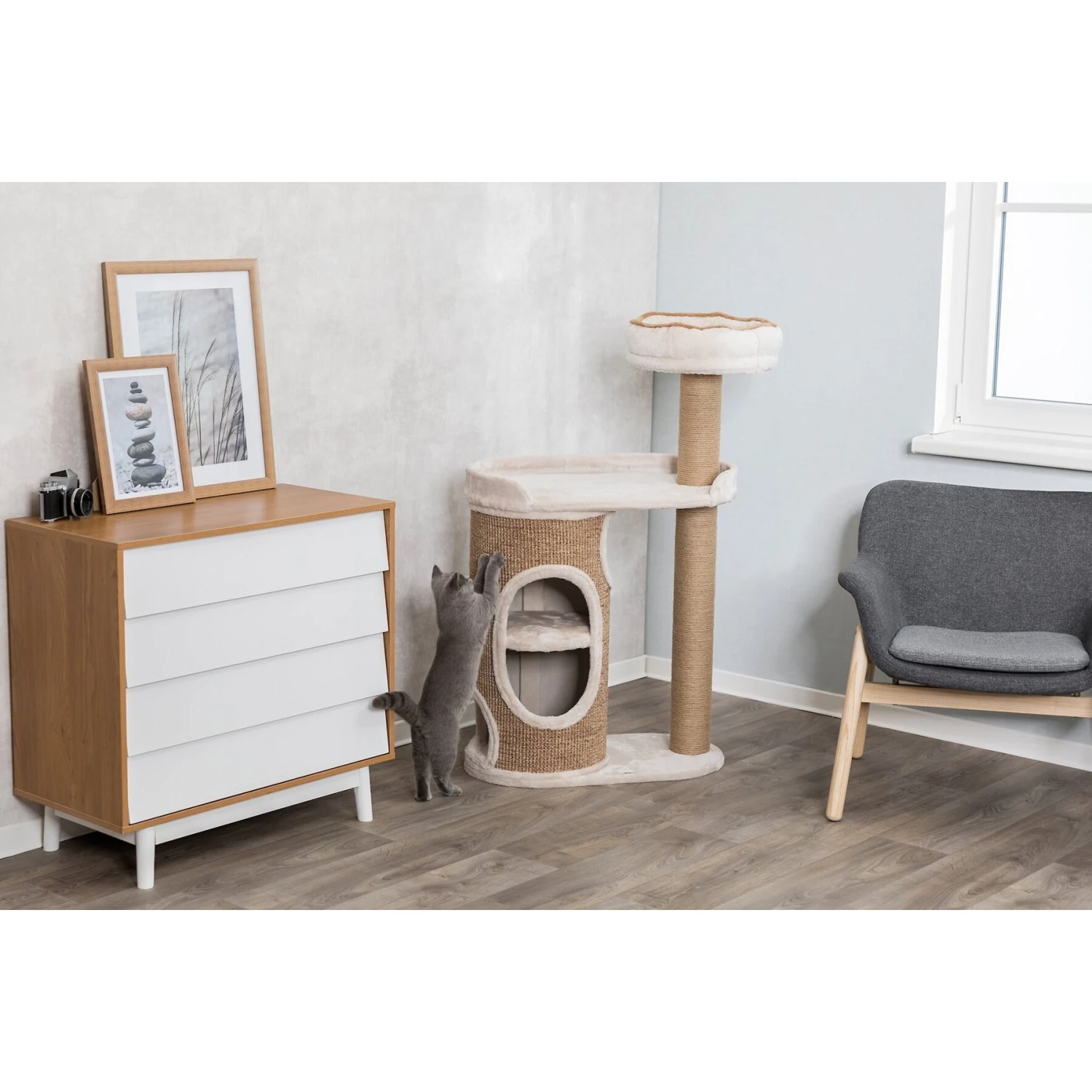 TRIXIE’s Falco Scratching Post Cat Condo not only gives off a paw-sitively modern appeal, but it’s also incredibly comfortable! The stylish design is complemented with a soft plush furnishing to provide your pet with a cozy surface for sleeping and relaxing. To satisfy your feline friend’s need to scratch, the condo includes a large jute-covered barrel and jute-wrapped posts that are purr-fect for claws. Your kitty will have plenty of options when it comes time to rest—she can curl-up in the two-story condo, spread-out on the elevated platform or snuggle into the top-level bed!