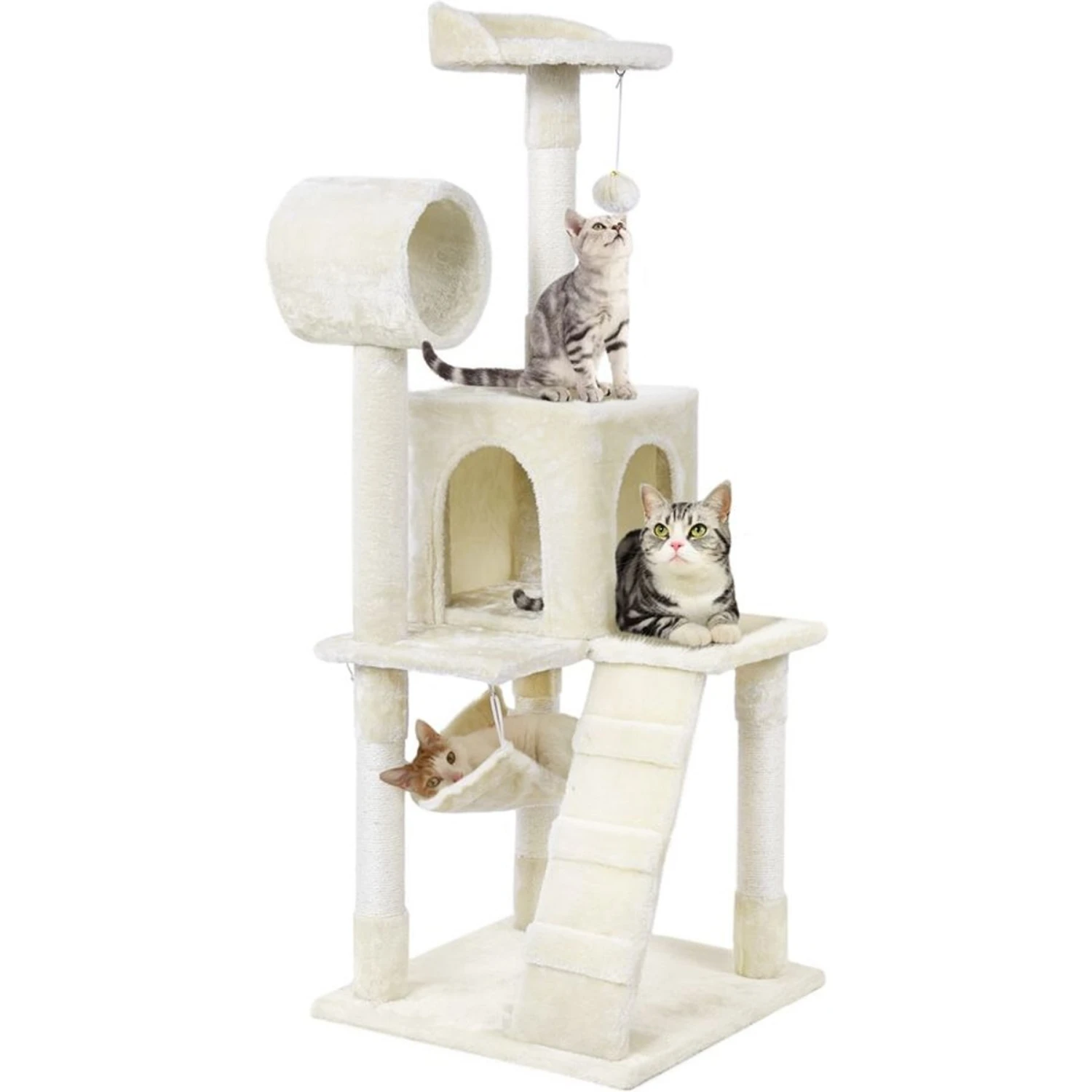 Give your tiny feline adventurers a new spot to explore with the Yaheetech 51-in Plush Multi-Cat Kitten Tree & Condo. This multi-level cat tree is perfect for one or two smaller cats or kittens to pounce, play or nap. Your kitties can burrow through the included tunnel and climb up the ladder before taking a sweet snooze in the fluffy condo or the warmth of the cozy hammock. Multiple scratching posts covered with natural sisal rope help your kitties build good scratching habits—and help keep them away from your furniture! This activity center is also made with tear-resistant plush fabric and high-density particle board so your kitties to help your kitties stay comfortable and safe while enjoying a purr-fectly playful day!