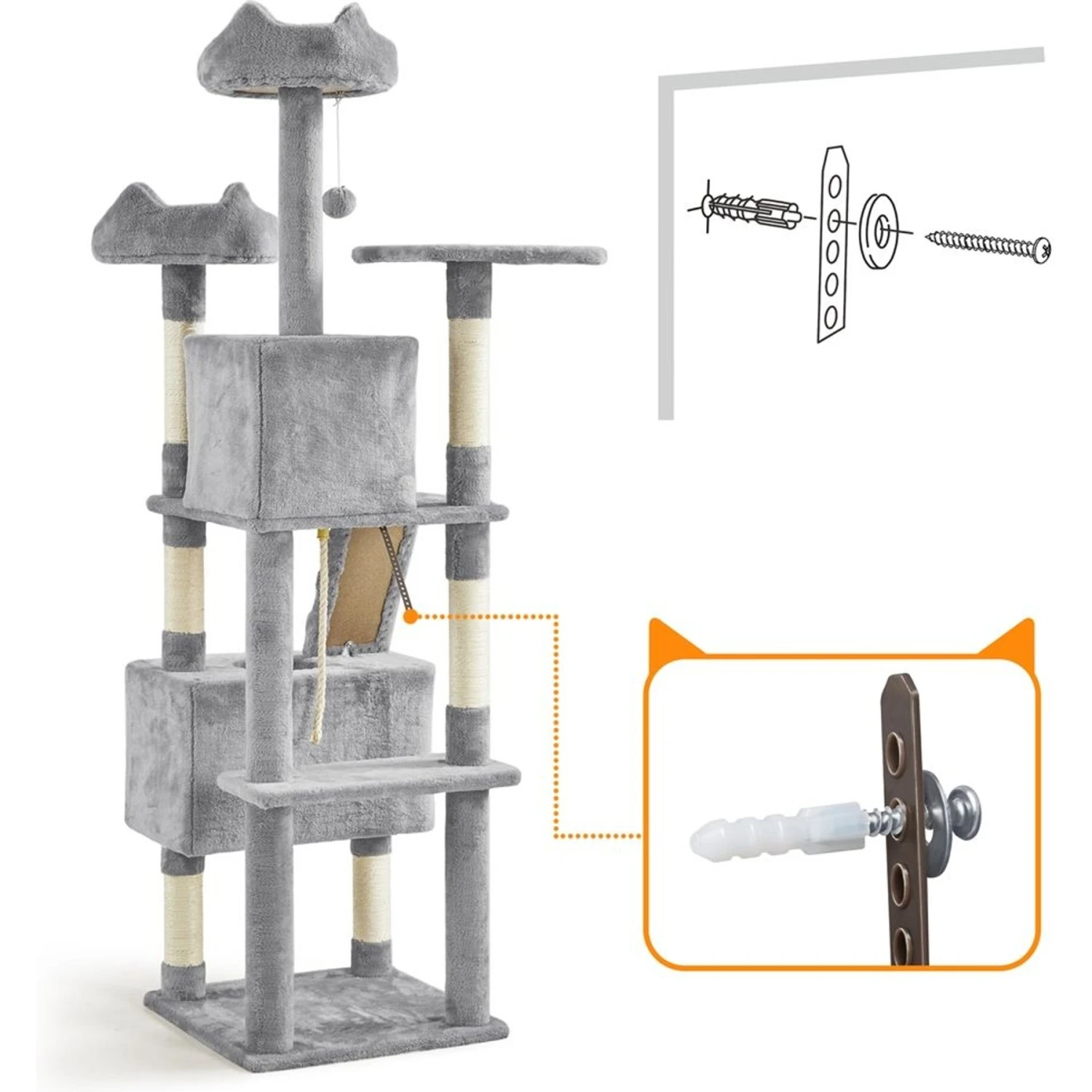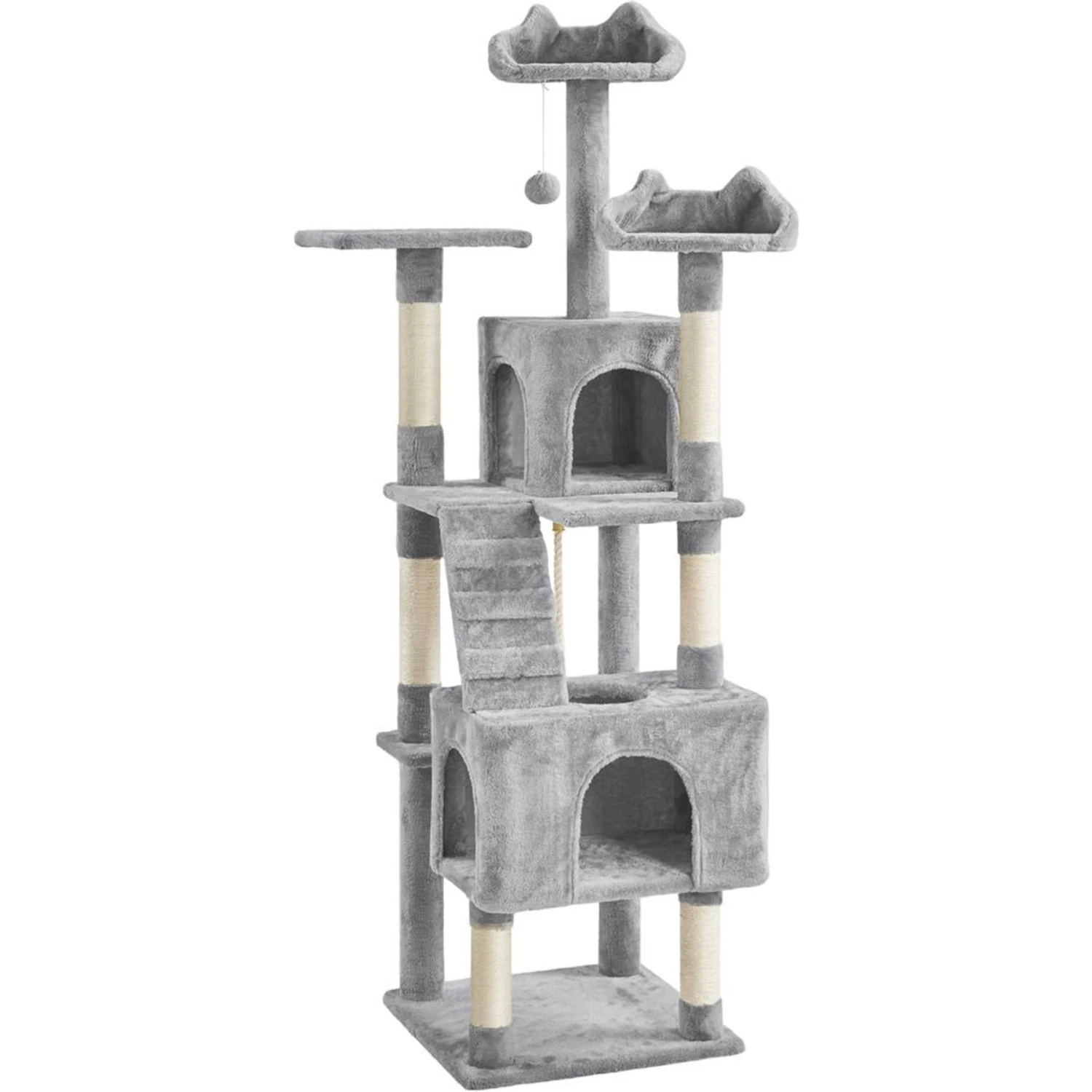 Give your furry friend the ultimate hangout spot with the Yaheetech 72-in Plush Cat Tree & Condo! This multi-level cat tree is constructed from sturdy particle board, skin-friendly materials, and natural sisal rope, providing your kitty with a safe, comfy playing and napping space. The all-in-one design combines entertainment with leisure, including two padded perches with raised edges, two roomy condos, one soft platform, a detachable fur ball, and six sisal rope-coiled scratching posts. Each tree can comfortably house two to three medium or large cats.