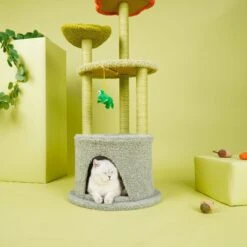 Give your kitty companion a place to kick back and relax with the ZEZE Adora Flower 43-in Carpet Cat Tree. This super cute cat house features a unique design that will look great anywhere in your home. It is crafted with two yellow and red flowers attached to the left side with a sturdy ash-colored base. This freestanding cat condo is designed with a roof on top of three pillars and four perches where your pal can keep watch over everything. The basement has two holes as entry and exit points that allow for plenty of ventilation. A carpet and sisal rope material covers a manufactured wood frame that will ensure your amigo has a place of her own for a long time to come.